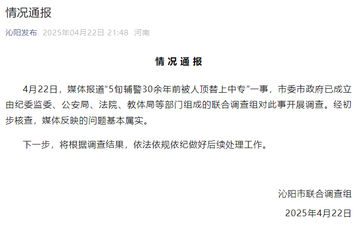 4月22日,媒体报道“5旬辅警30余年前被人顶替上中专”一事,市委市政府已成立由纪委监委、公安局、法院、教体局等部门组成的联合调查组对此事开展调查。经初步核查,媒体反映的问题基本属实。